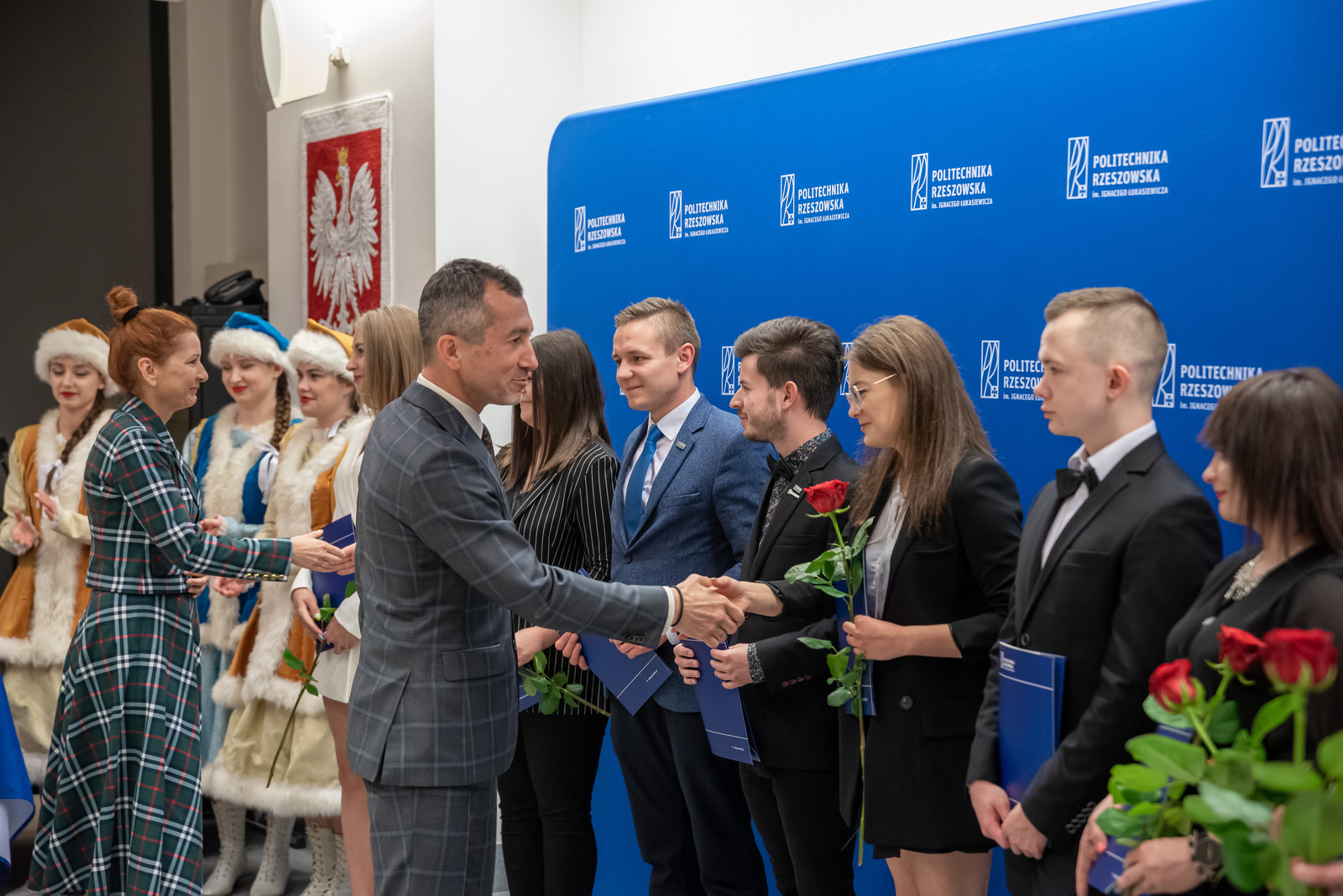 Uroczystość rozpoczęła się miłym artystycznym akcentem, jakim był występem wokalny dwóch wyróżnionych studentek z Wydziału Matematyki i Fizyki Stosowanej – Katarzyny Bieli i Klaudii Bukały. Następnie prorektor ds. kształcenia dr hab. Iwona Włoch, prof. PRz i prorektor ds. studenckich prof. dr hab. Grzegorz Ostasz wręczyli nagrody i lity gratulacyjne studentom. „Razem z panią prof. Iwoną Włoch mamy ogromną satysfakcję, wręczając w imieniu JM Rektora nagrody tak licznej grupie studentów naszej Politechniki. Wyróżnieni zostali nie tylko przedstawiciele wszystkich wydziałów, ale też liderzy Samorządu Studenckiego oraz grupa sportowców reprezentująca Akademicki Związek Sportowy. Wszyscy Państwo świetnie pokazaliście, że można łączyć obowiązki studenta z prawdziwą pasją na różnych płaszczyznach. Serdecznie wszystkim gratulujemy" - powiedział prof. G. Ostasz.