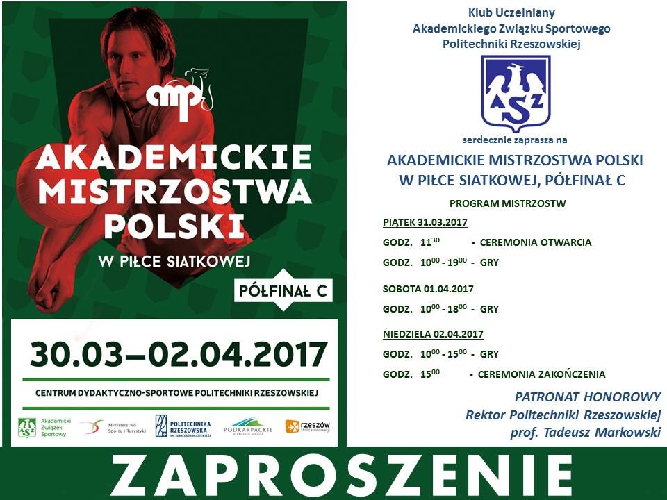 Klub Uczelniany AZS PRz zaprasza na półfinał C AMP w Piłce Siatkowej. Mecze będą rozgrywane przez cztery dni (od 30 marca do 2 kwietnia br.). Wystąpi dziesięć drużyn: AGH Kraków, AWF Biała Podlaska, AWF Kraków, Politechnika Krakowska, Politechnika Rzeszowska, Uniwersytet Ekonomiczny w Krakowie, Uniwersytet Jagielloński, UMCS w Lublinie, Uniwersytet Pedagogiczny w Krakowie i Uniwersytet Rzeszowski.