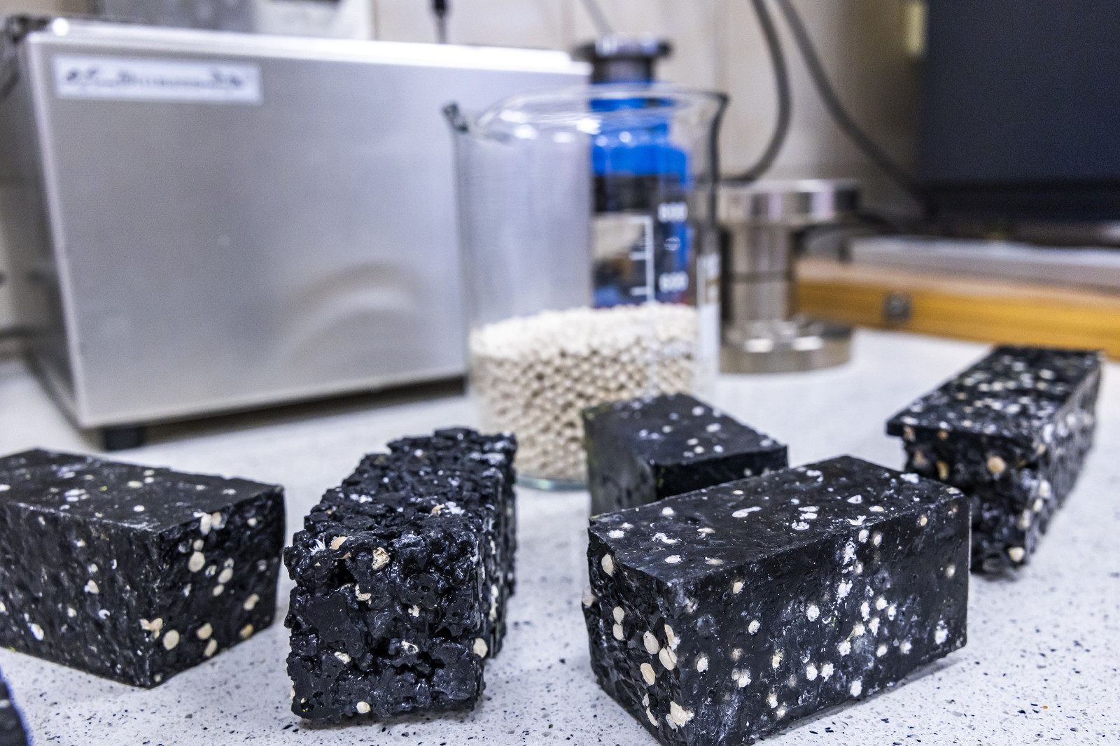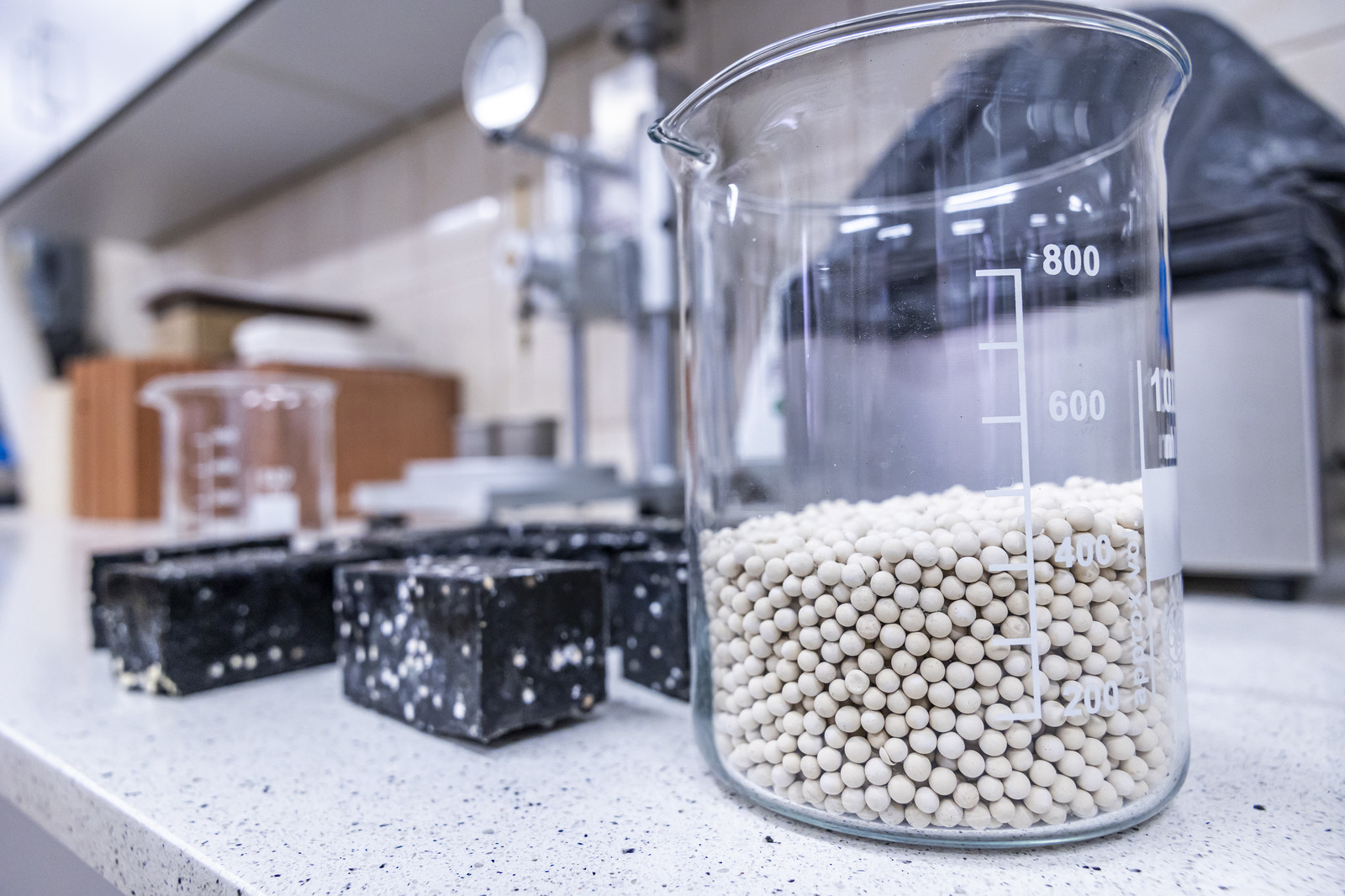 Opracowanie kompozytowych akumulatorów ciepła ma na celu rozwiązanie tych problemów przez zastosowanie w ich budowie (oprócz materiału zmiennofazowego) dodatkowo krzemionkowych sit molekularnych oraz recyklatu węglowego. Użycie krzemionkowych sit molekularnych pozwoliło na związanie w ich strukturze materiału zmiennofazowego, dzięki czemu znacząco ograniczono możliwość niekontrolowanego wycieku PCM, zwiększając jednocześnie kompatybilność nasyconych PCM sit molekularnych z innymi materiałami. Z kolei użycie recyklatu węglowego pozwoliło na zwieszenie efektywności odzysku zmagazynowanego w strukturze akumulatora ciepła. W ramach realizowanego projektu przeprowadzono serię badań eksperymentalnych funkcjonowania cieplnego oraz wytrzymałościowych nowych kompozytów magazynujących ciepło oraz analizę statystyczną otrzymanych wyników. W programie Statistica 12 opracowano plan doświadczeń, następnie wykonano stanowisko laboratoryjne do próżniowego nasycania sit molekularnych ciekłym materiałem zmiennofazowym. W dalszej kolejności wykonano 96 kompozytowych akumulatorów ciepła o różnej zawartości każdego z trzech komponentów: sit molekularnych, nasączonych PCM, matrycy cementowej lub epoksydowej, recyklatu węglowego. Kompozyty miały formę prostopadłościanów o wymiarach 40 mm x 40 mm x 160 mm i były poddane badaniom cieplnym w komorze klimatycznej (badania obciążenia cieplnego oraz mrozoodporności), badaniom jakościowym stygnięcia próbek przy użyciu kamery termowizyjnej oraz niszczącym badaniom w maszynie wytrzymałościowej. Otrzymane wyniki stworzyły bazę danych pozwalających na opracowanie wzorów matematycznych określających wpływ zawartości każdego z trzech składników na funkcjonowanie cieplne oraz właściwości wytrzymałościowe tych kompozytów.
